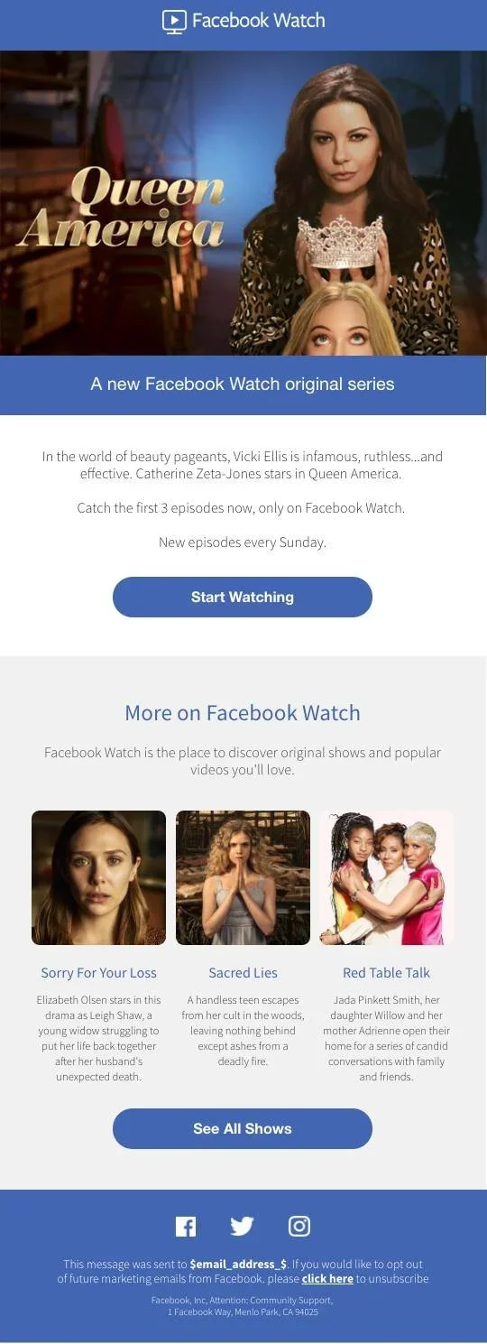 As the Content Designer responsible for growing Facebook Watch, I worked on the UX content itself as well as a number of marketing campaigns. I worked closely with the Product Marketing team to define terminology and align language for a coherent promotional experience in-product and off-platform. These campaigns focused on the features of Facebook Watch as well as the original content featured on it. I also worked on Facebook Watch promotions for specific events, such as sports games and election nights. I developed content for the Facebook Watch mobile app, website, and TV app.