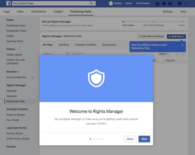 In order to protect the music rights of different users on Facebook, the Publishing Tools team launched multiple versions of Rights Manager. I renamed and established a new naming convention for the suite of Rights Manager products, which are now named according to their users (eg. Rights Manager for Creators). I wrote the UI content for each version of Rights Manager, which allows music owners (and other stakeholders) to set up rules for different audio assets. I also wrote the experience for when people’s content is affected by music rights, which includes notifications, takedowns, and appeals flows.